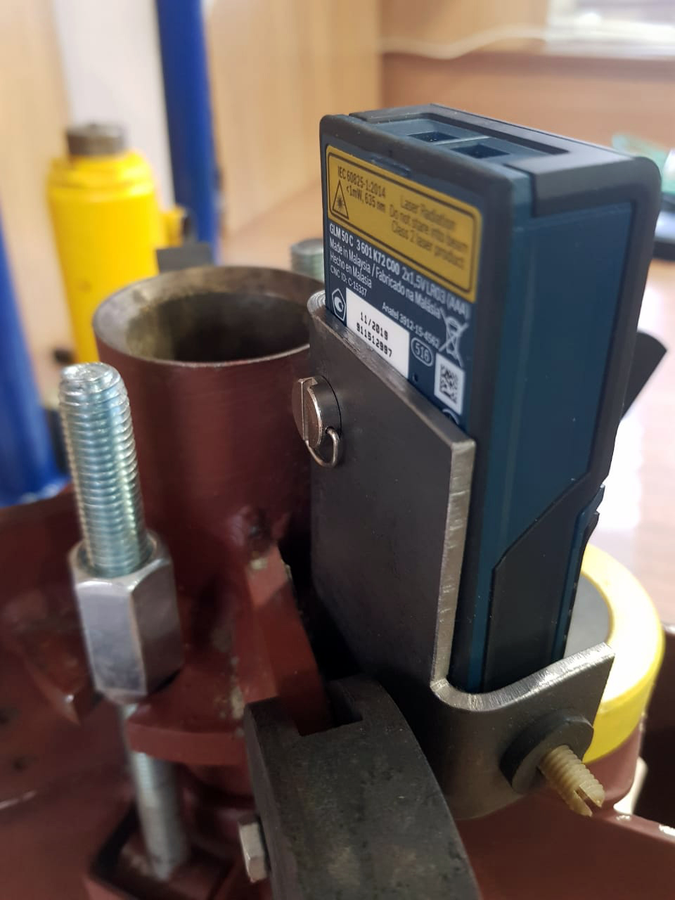 Включить устройство BOSCH GLM 50C, активировать лазерный луч и убедиться в том, что он попадает в среднюю зону на мишени наковальни. При необходимости следует отрегулировать направление луча с помощью регулировочных винтов кронштейна.