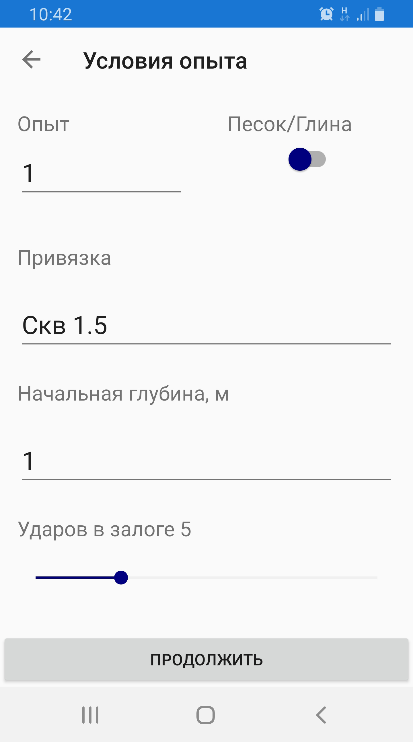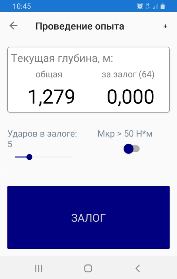 Оператор поднимает молот и наносит первый удар по наковальне. Индикация текущей глубины и перемещения за залог, начинается после первого удара, если в залоге 1 удар (рекомендуется, при перемещениях за удар более 2 см) или после всего залога после нажатия клавиши «Залог». Величину количества ударов в залоге можно менять в процессе выполнения опыта.