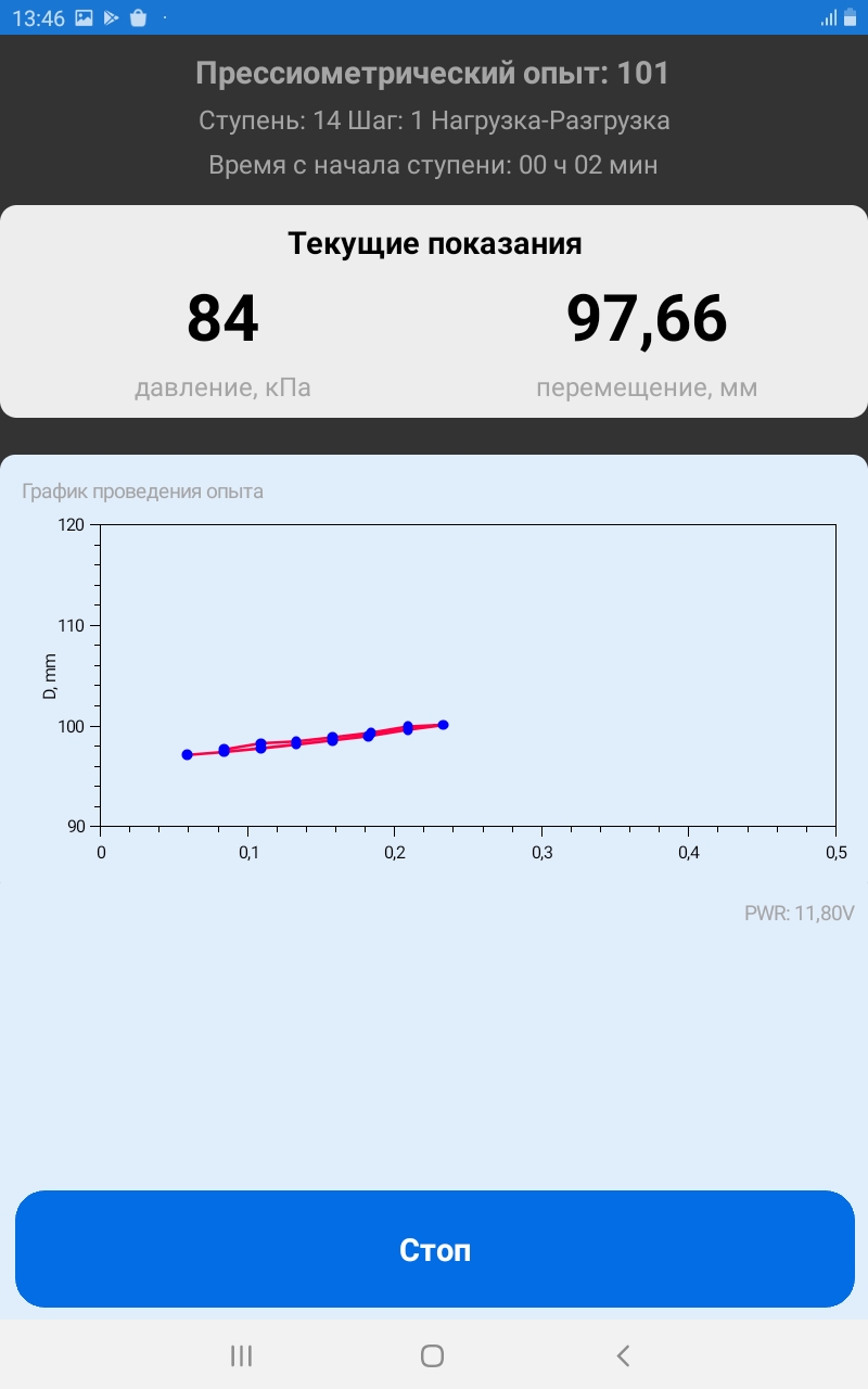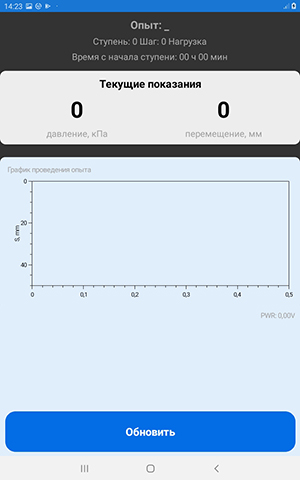 Вид испытания (штамповый или прессиометрический) определяется автоматически. На экране можно наблюдать текущее давление в пневмосистеме, осадку или перемещение в миллиметрах. Схема испытания, номер ступени и шага, а также время прошедшее с начала ступени так же отображаются в приложении.